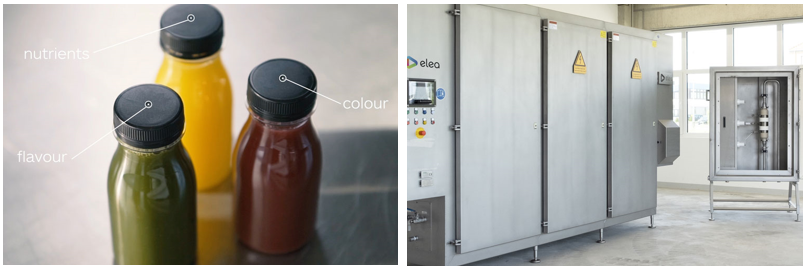 Figure 2: Fruit juices treated with PEF technology and example of a PEF unit on an industrial scale (Image: ELEA)