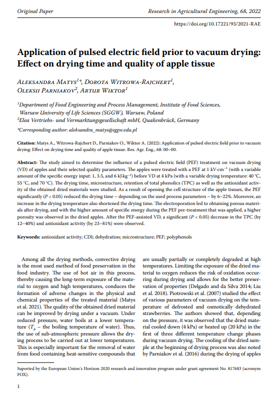 Article: Application of pulsed electric field prior to vacuum drying: Effect on drying time and quality of apple tissue (Jun. 2022)