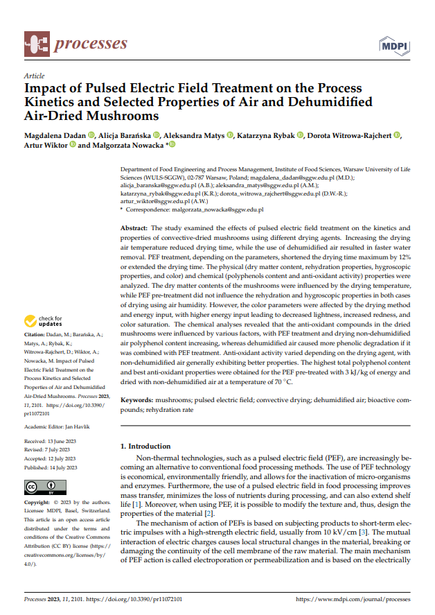 Article: Impact of Pulsed Electric Field Treatment on the Process Kinetics and Selected Properties of Air and Dehumidified Air-Dried Mushrooms (July 2023)